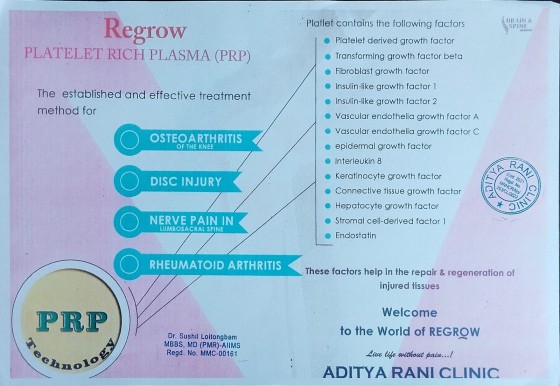 Platelet are certain particles found in human blood , which helps in repairing any injuries to body parts or cells or tissues. PRP involves separating these platelets from the blood, by an elaborate process. Then these particles are activated by an activator, and two medicines are added for special function. These are then given to the injured knee or spine, shoulder, hip, ankle or ligaments and tendons. The healing process starts, and will continue for months. The PRP process in our clinic is totally different from those injections given at other hospitals or clinics in Manipur or other north eastern states. This process was initially developed at AIIMS, new delhi and then perfected by Dr Sushil Loitongbam, during a long period of clinical study and improvements. PRP doesn't have the side effect of Steroid injections like diabetes worsening, gastric ulceration or bone thinning.